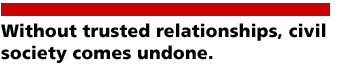 Without trusted relationships, civil society comes undone. Francis Fukuyama and others have made a case for the centrality of trust to our economic life, and of course trust is the essential ingredient for democratic governance. But as many commentators have noted, in recent years trust has been in decline in our society. The issue is complex and opinions vary about causes. However, whether it is the barrage of corporate scandals, the low esteem in which most people hold the news media (the source of our public knowledge), or the controversy over vote counting in Florida, symptoms of distrust are rampant.