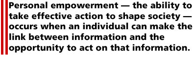 Personal empowerment the ability to take effective action to shape society occurs when an individual can make the link between information and the opportunity to act on that information. You might say that there is an "algorithm for empowerment" that transforms information into knowledge by providing a context for interpretation and action. By participating in social networks, each of us is able to communicate with others in a way that offers the opportunity to take effective action. The ASN extends this opportunity even further by using the Internet to link people across social networks. In particular, it fosters a non-hierarchical distribution of information, and encourages decentralized forms of organization, which can appear in an ad hoc fashion, swarming into existence around a particular objective, and then dissipating when the objective has been accomplished.