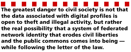 Commercial interests are now driving the Internet in a direction that risks leaving important potentials untapped. As mentioned above, legal obstacles, such as intellectual property statues written in another era, threaten to suppress an extraordinary flowering of creativity and information sharing that the Internet already makes possible. The enthusiastic privatization of Internet infrastructure is also an area of concern, potentially leading to a carving up of the Internet into discrete, walled domains, with fees charged at borders. In fact, the cable industry has already begun to establish classifications for different kinds of services, chipping away at the Net’s open architecture. Another concern has to do with the issue of online identity management. Two business-based initiatives the Passport initiative that is part of Microsoft’s .Net architecture and the Liberty Alliance are deliberate efforts to create de-facto standards for personal identity online. Unfortunately, these are primarily focused on how you behave as a consumer, rather than as an independent citizen apart from the commercial arena; their intent is to privatize this information, and then manage it in a way that gives them a share of every financial transaction you make. Current trends are pushing the Internet to become a closed, controlled, commercial space that most resembles a shopping mall. Certainly these initiatives show good business sense, but are they sound public policy?