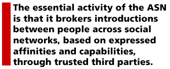 As we discuss later in this paper, various flavors of this kind of "introduction" technology are being incorporated into online community infrastructures today. However, each of these communities operates as a "walled castle," separate and distinct from the rest of the Internet. The knowledge and relationships generated inside one community do not travel beyond its borders. The ASN will allow for narrowly defined, carefully targeted interconnections between communities, so that knowledge and relationships can be leveraged across the Internet as a whole. It also proposes a set of tools to be "plugged in" to community infrastructures that will support this enhanced communication across existing social networks.