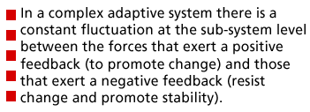 "that for cultural evolution to occur the fidelity of transmission must lie within a particular range. The fidelity cannot be 100 percent because culture would have no variation, which is required for differential survival to drive evolutionary change. The fidelity must still be very high, or else culture would have no continuity between individuals and 'good tricks' would be lost as quickly as gained, and again evolution would not occur." (Rose, 1998)The numerous changes to information that occur in its transmission around the Connecticon is another emergent property of the system complex system cycles. It is supported by the actions of the second layer of the Connecticon, the human resource that interfaces with the technological infrastructure. The changes made by the human interface in amending, adapting, and contextualising information occur both by accident and design, but do not occur with every communication of the information. It is this very mutation of an idea to create a slightly different meme that can be used to interpret progressive change of knowledge and understanding. Like its counterpart the gene, the meme does not control its own mutation, and with the infinitely large number of connections (possible and actual) the information is communicated across the super-network of the Connecticon, and an infinite number of potential innovations will be created. These innovations may be copied and communicated to other parts of the system, but their persistence over time, like their counterparts in biological evolution, will depend upon natural selection of the ideas that are adapted to the environment that they reach. From the business or development perspective, the ideas that provide a useful function, whether it is a new source of profit, a more efficient way of operating, or a better organisational structure, will survive. If their survival persists they may help to form a new domain of stability. If the mutation is only successful in the short-term, or the environment changes, then the meme will cease to be culturally appropriate, and like the collapse of dot.com companies, they will be replicated less frequently.