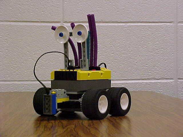 Figure 3: A photograph of Jessica’s and Kimberlyn’s robot. The children’s caption for this photograph referred to objects that were not in the picture.Their final caption was: "The robot works very good. It can see black lines and follow them." An obvious (and easily fixed) problem with this caption is that the children used "good" when they should have used "well." Slightly less obvious, perhaps, is the fact that there are no black lines in this picture. A caption that refers to things not in evidence might confuse viewers. In an effort to make sense of the caption, viewers might make the mistake of looking at the lines on the table or the lines on the wall behind the robot. Neither, of course, has anything to do with the black lines that the children have in mind, the ones they had laid out for demonstrations before captioning began (the black lines of a race course).