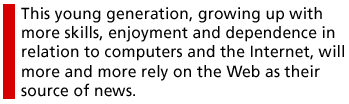 The implication is that this young generation, growing up with more skills, enjoyment and dependence in relation to computers and the Internet, will more and more rely on the Web as their source of news. The Internet is the news medium of the future in this sense.