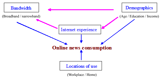 Whatever measures are used and wherever they are conducted, the mere statistics presented above show a clear trend of a strong growth of online news in communities deeply penetrated by the Internet. It is not exaggerating to predict that online news will sooner or later, along with the established news media, play a comparatively major role in informing the public and shaping its opinions and knowledge. A deeper look at the profile and online behaviours of online news users provides more hints of this potentiality. Figure 1 shows major structural factors with potential influence on the use of news on the Web, including demographics, bandwidth, Internet experience and use locations. All these factors have direct influence on the use of online news, indicated by the blue arrows. What's more, some of these direct factors have closely mutual relationships, indicated by the pink arrows, making them more decisive in acting as indirect influences on the potential for a wide adoption of online news in the future. Details and supportive evidence of these relationships are discussed below.