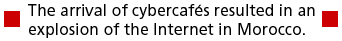 Cybercafés have become favourite hangout stations and meeting places for Morocco’s Internet users, particularly the young. They are open to all, there is no age limit and the fees vary according to location, ranging from 50 cents to one USD per hour. A recent study found that more than 50 percent of cybercafés are frequented everyday by between 3070 persons (Jankari, 2002). The arrival of cybercafés resulted in an explosion of the Internet in Morocco. Many experts believe that Morocco is by far one of Africa’s most advanced countries in terms of the Internet.