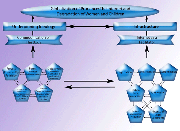 With increasing potential for dissemination of pornographic materials, the Internet has become a powerful purveyor of prurient pictures and messages. Pornography, and free access to it through the Internet, debase the Web and dehumanize emotions. In this process, the voyeur becomes at once a prying observer and also a participant in actively degrading human beings, particularly through the commodification of women and children. First, in exploring how the Web facilitates the production and dissemination of pornography, we will analyze the Web’s unique infrastructure that facilitates pornography through the Internet: digitization, unregulated commercialization, virtual communities created by technosocial interactions, users’ anonymity, facilities for product customization and instant international production, and absence of legal constraints on the Web. Second, in order to understand how and why pornographic materials pervade the Web, we will examine the ideological underpinnings through the concept of 'commodification' as it applies to the body. In this examination, we will study the process, forms, and objectives of 'commodification' of the body, the international division of this commodification, and gender segmentation that governs it ( Diagram 1).