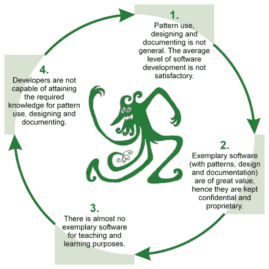 Figure 1: The vicious circle (drawing by Katalin Bérczi). The motivation for writing this article is the recognition of the software development craft’s vicious circle (Figure 1), and a vision of getting out of it. The vicious circle is the following: Step 1. Pattern use, designing and documenting is not general. The average level of software development is not satisfactory. Therefore: Step 2. Exemplary software (with patterns, design, and documentation) are of great value, hence they are kept confidential and proprietary. Therefore: Step 3. There is almost no exemplary software for teaching and learning purposes. Therefore: Step 4. Developers are not capable of attaining the required knowledge for pattern use, designing and documenting. Therefore: Go to Step 1, and the circle closes.