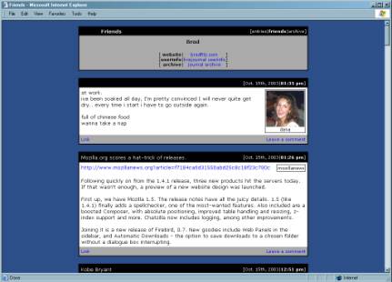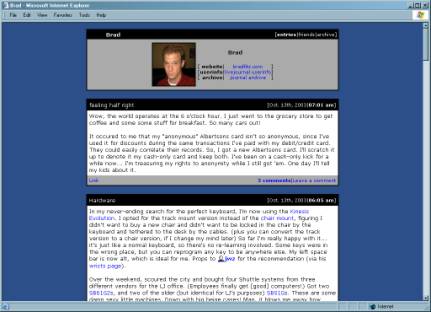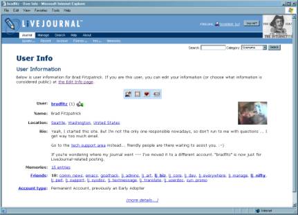 Figure 3: Profile page in LiveJournal.Another feature of the profile page that is crucial to the community aspect of LiveJournal is the ability to add other users to your "friends list." As you can see in Figure 3, the user bradfitz has eighteen "friends" listed. This means that when he goes to his "friends page" (Figure 4), he will see an amalgamated list of his friends’ most recent journal entries.