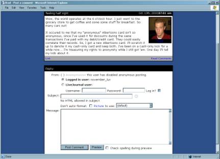 On other blogging services, people can post replies under whatever name they want, without even having an account on the system. It is thus harder to track who is reading your journal and who is getting involved in discussions. The lack of profile pages in other services makes it harder to get information on people who read or reply to your journal, thereby increasing the difficulty of connecting with others.