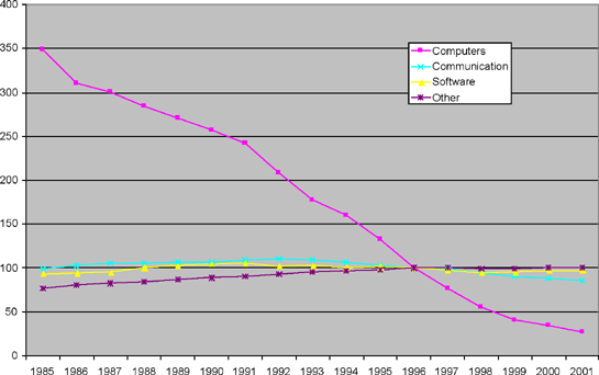 To implement the decomposition, Oliner and Sichel need estimates of the sectoral total factor productivity growth rates. Here they use a common and theoretically interesting assumption. This is that price decreases in computer and semiconductor manufacturing result from improvements in total factor productivity. The basic assumption is that if the semiconductor industry, for example, is able to continuously cut prices without losing its profitability, and if the input prices for the industry do not decrease, the source of the output price decline has to be better productivity. Output price decline, therefore, becomes a simple measure for total factor productivity increases in the industry. For researchers, this has the major benefit that output prices can be observed directly.