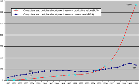 Oliner and Sichel use price and capital stock estimates provided by the U.S. Bureau of Economic Advisers (BEA) and Bureau of Labor Statistics (BLS). Although these estimates are based on extensive studies, they are also known to have conceptual and empirical problems. One important conceptual problem is that the underlying price estimation models are not able to account for qualitative changes in the use of computers. Although the price indices that provide the basis for calculating ICT investments and capital stocks are commonly thought to model quality change, in reality they are only able to measure improvement in existing qualities [ 53]. Oliner and Sichel therefore implicitly assume, for example, that personal computers from different decades can be categorized as members of the same class. Empirically, however, it looks probable that the use of broadbandconnected PCs with advanced audio and video capabilities is essentially different from the use of 1980s PCs, for example. The price indices that underlie the Oliner and Sichel study have theoretical difficulties in crossing such qualitative discontinuities. It is therefore possible that the existing capital stocks and the user costs of ICT are over or underestimated. As the neoclassical framework does not say anything about discontinuous qualitative change, we actually cannot say much about the size of the resulting estimation errors in general. One could, however, speculate that when the importance of innovative activities grows in the economy, these discontinuities become increasingly important. Although they could have been relatively invisible when production was largely based on massproduced goods, they perhaps need to be taken into account in knowledge and innovationbased economies.