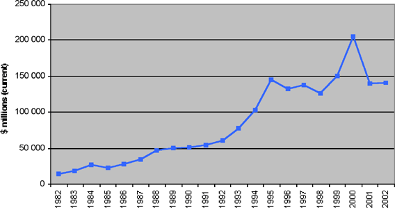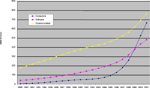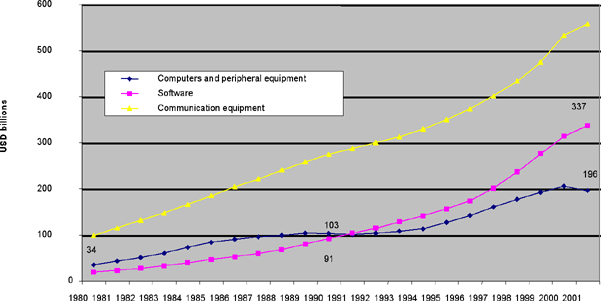 The importance of these effects depends on the importance of ICTs in the economy. The overall effect may be small, if ICT production and investments represent only a small fraction of the total economy. In fact, this has been the case until recently. In the EU, ICT manufacturing and services are less than six percent of GDP, Ireland and Finland being the most ICT manufacturing intensive countries [ 45]. The value added in ICT manufacturing and services reached about 8.6 percent of the Finnish GDP in the year 2000, whereas it was about 8.1 percent in the U.S. [ 46] The role of ICT investments, however, has been growing during the last decades, and as a result ICTs now start to have a considerable impact on economic growth. In OECD countries, the contribution of ICT capital to GDP growth increased from about 16 percent to about 20 percent from the first to the second half of the 1990s [ 47]. The impact has been pronounced in the U.S., where the level of ICT investments has been relatively high already for several decades.