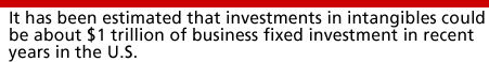 For example, although investments in research and development have been studied extensively since the 1960s by productivity researchers, knowledge creation is still only very inadequately accounted for. It has been estimated that investments in intangibles not including human capital accumulated in the household sector could be about $1 trillion of business fixed investment in recent years in the U.S. This is almost as much as the accounted business investment, about US$1.2 trillion in 2001 [ 1]. Productivity is measured as the efficiency of producing outputs from the inputs, but if we miss important outputs and inputs, our efficiency measures and policy recommendations easily become misleading.