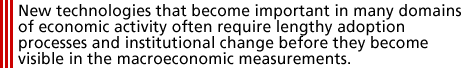 In fact, productivity researchers often point out that the "technological progress" represented by the Solow residual does not imply technological progress. It can simply mean more efficient ways to organize work, better institutional structures, or good weather. Economic historians have also frequently pointed out that the reverse is true as well: technological advances do not imply changes in productivity [ 34]. New technologies that become important in many domains of economic activity often require lengthy adoption processes and institutional change before they become visible in the macroeconomic measurements [35].