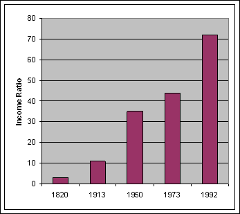 Figure 1: Longterm trend in world income distribution between countries (ratio between the world’s richest and poorest country for selected years). (Source: UNDP Human Development Report 1999, p. 38)