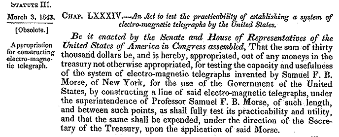 Figure 4: A US$30,000 congressional grant seeded the American telegraph industry. [25]