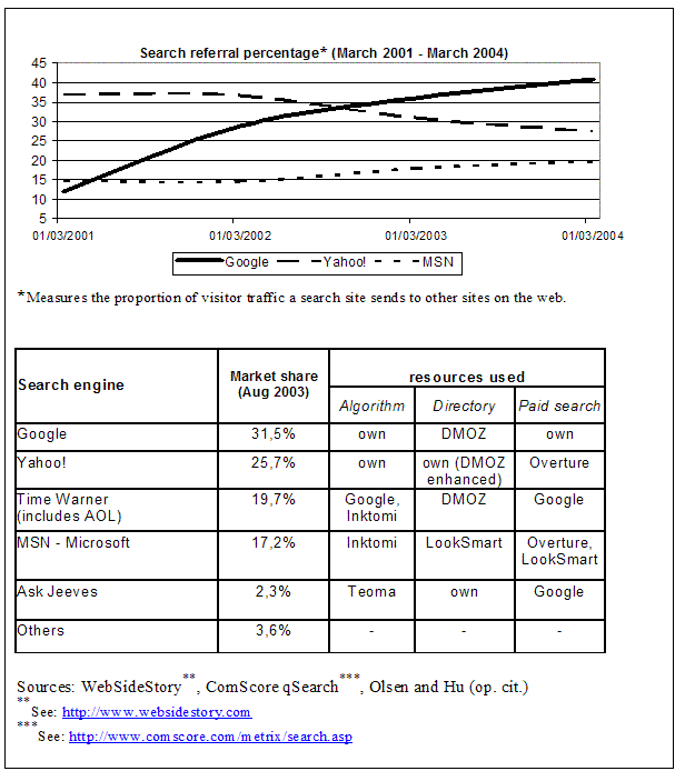 Figure 1: Some data on the Internet search market.There is a risk that the distance between paid and relevancedriven searches is going to fade. In general, the noncommercial roots of Internetbased directories are drying up and with them the opportunity to distinguish between useful and worthless information.